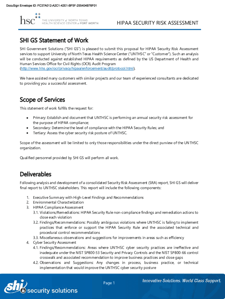 HIPAA SECURITY RISK ASSESSMENTS HI GS Statement of Work SHI Government Solutions (SHI GS) is pleased to submit this proposal for HIPAA Security Risk Assessment services to support University of North
