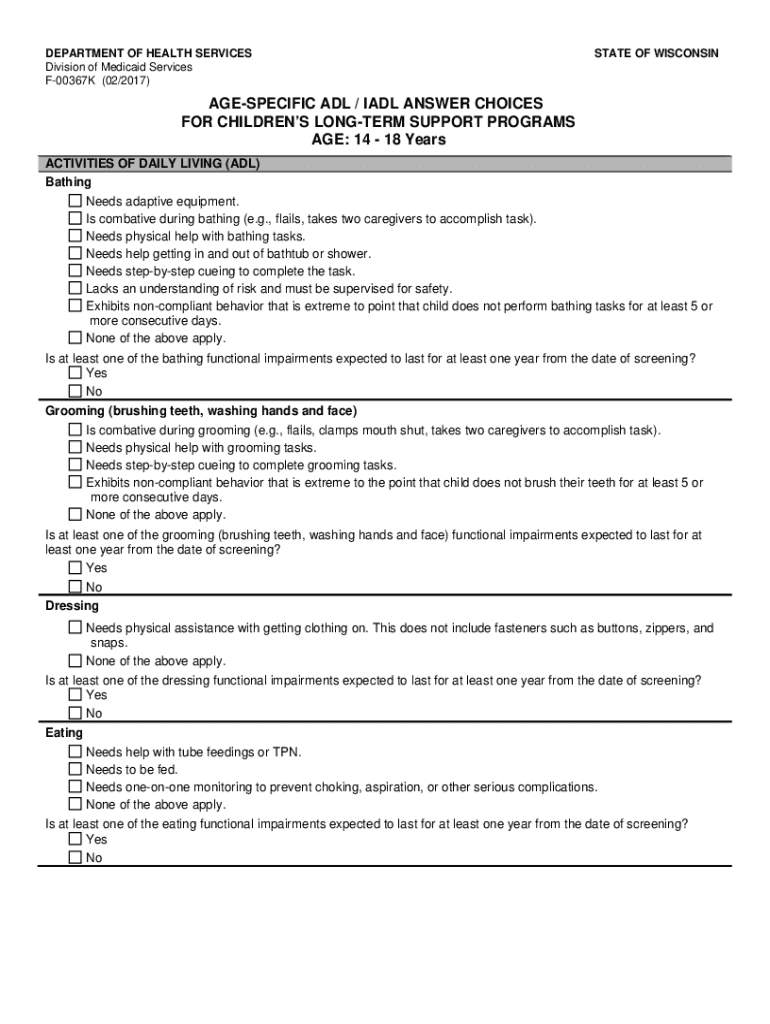 F00367K (02/2017)STATE OF WISCONSINAGESPECIFIC ADL / IDL ANSWER CHOICES
