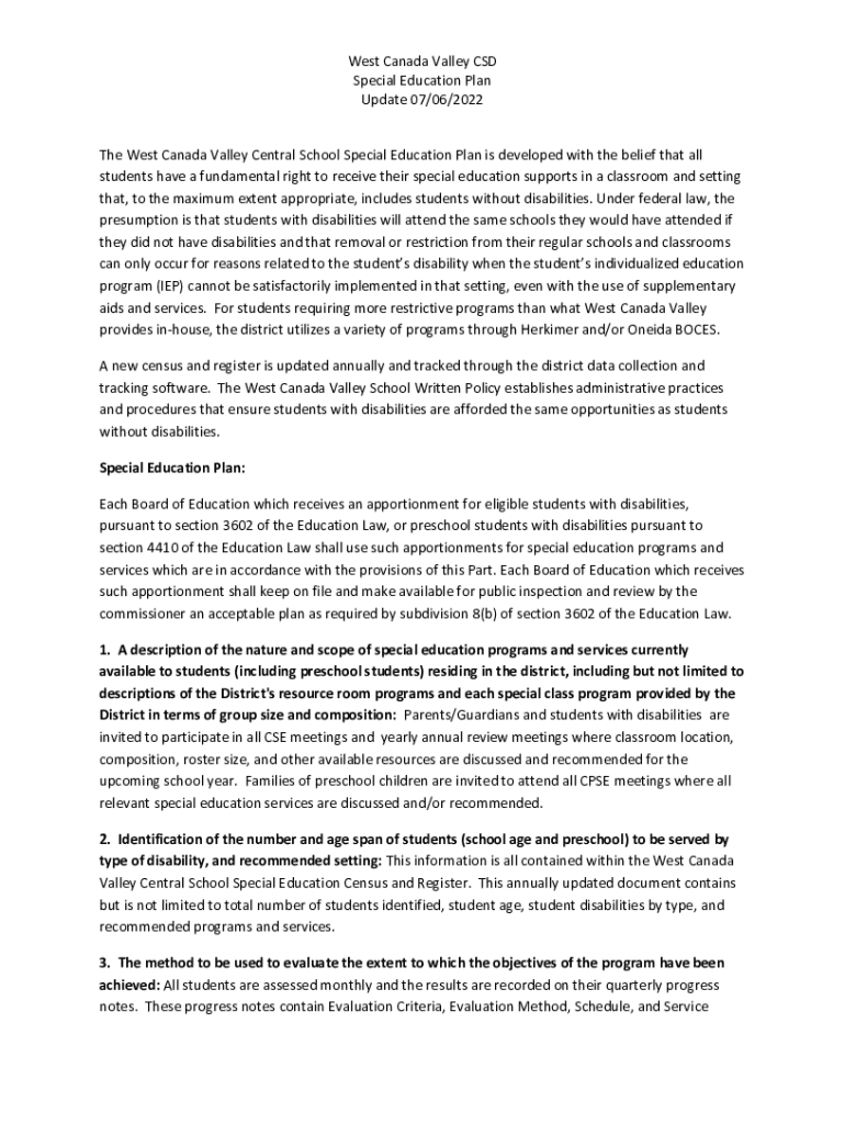 West Canada Valley CSD Special Education Plan Update 07/06/2022 The West Canada Valley Central School Special Education Plan is developed with the belief that all students have a fundamental right