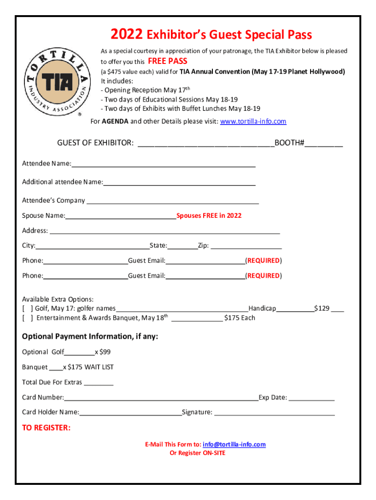 2022ExhibitorsGuestSpecialPass Asaspecialcourtesyinappreciationofyourpatronage, theTIAExhibitorbelowispleased toofferyouthisFREEPASS (a$475valueeach)validforTIAAnnualConvention(May1719PlanetHollywood)It