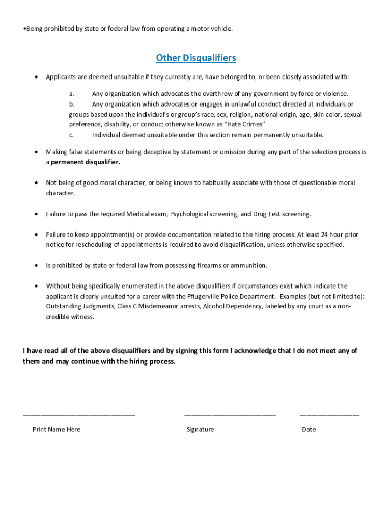 Pflugerville Police Applicant Disqualifies Any of the following will disqualify an applicant from further consideration at any stage of the process. (Signature is required on Page 4)6 Month Disqualifies