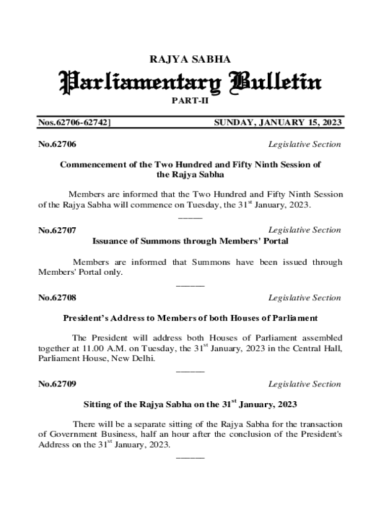 RAJA SABHAParliamentary Bulletin PART Nos.6270662742] No.62706SUNDAY, JANUARY 15, 2023, Legislative SectionCommencement of the Two Hundred and Fifty Ninth Sessions of the Raja Sasha Members are informed