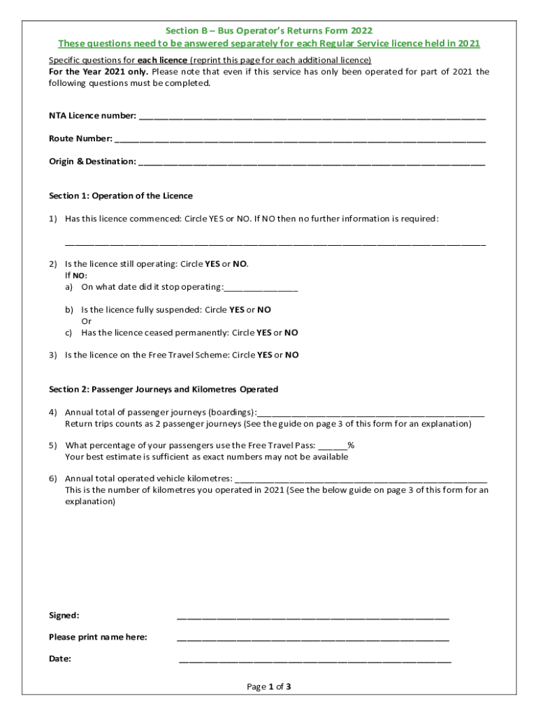 Section B Bus Operators Returns Form 2022 These questions need to be answered separately for each Regular Service license held in 2021 Specific questions for each license (reprint this page for each