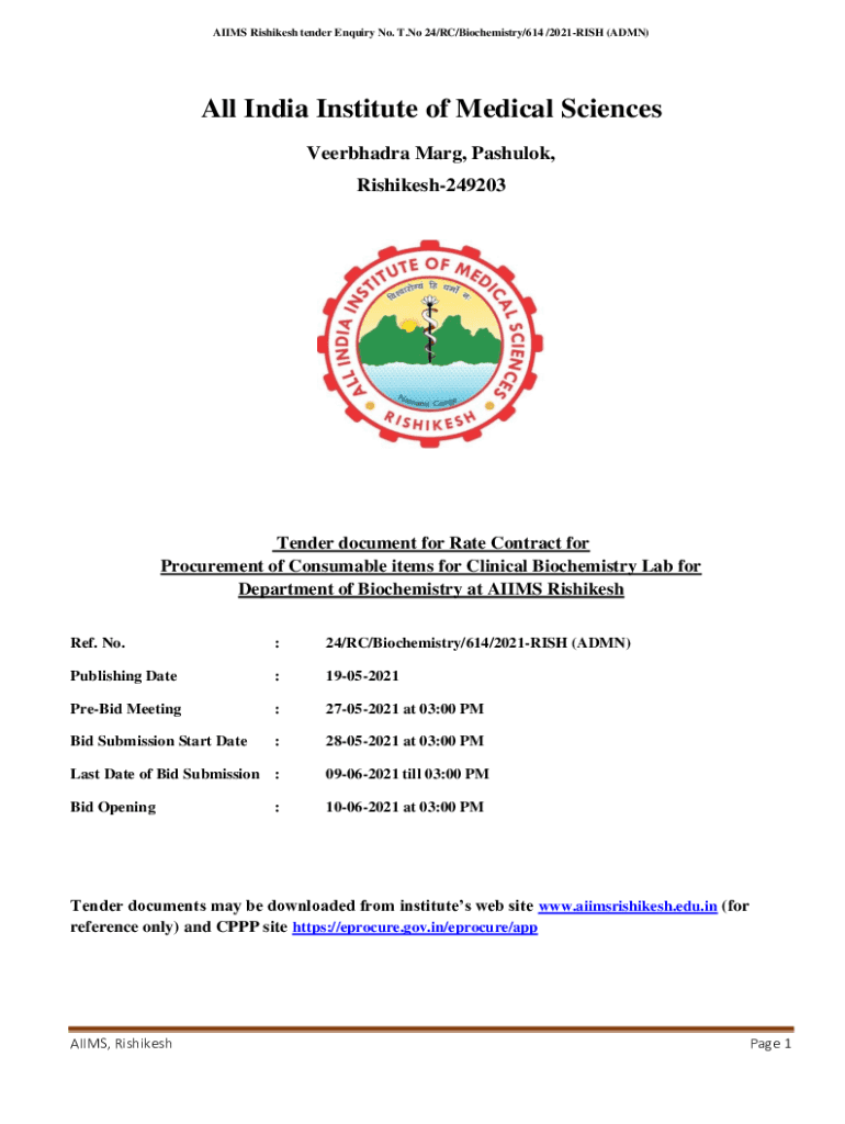 AIMS Rishikesh tender Inquiry No. T. No 24/RC/Biochemistry/614 /2021RISH (ADEN)All India Institute of Medical Sciences Veerbhadra Mary, Passbook, Rishikesh249203Tender document for Rate Contract for