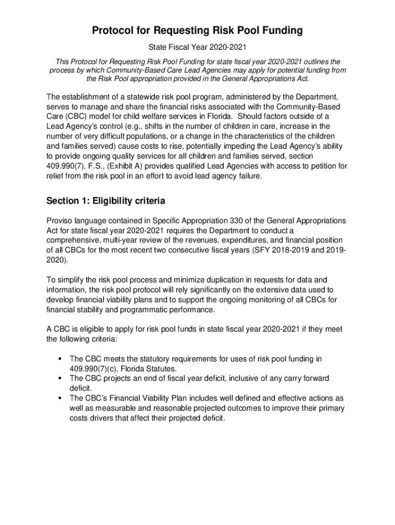 Protocol for Requesting Risk Pool Funding State Fiscal Year 20202021 This Protocol for Requesting Risk Pool Funding for state fiscal year 20202021 outlines the process by which CommunityBased Care