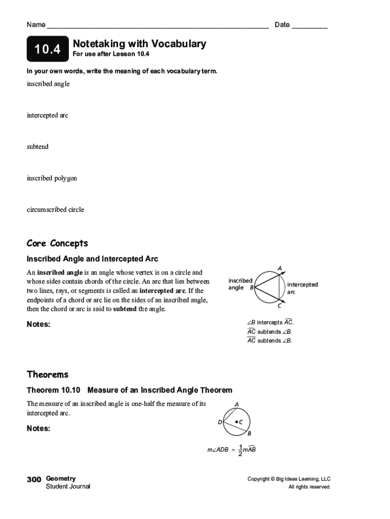 Name ___ Date ___with Vocabulary 10.4 Note-taking For use after Lesson 10.4 In your own words, write the meaning of each vocabulary term. Inscribed angle intercepted arcsubtendinscribed polygon circumscribed