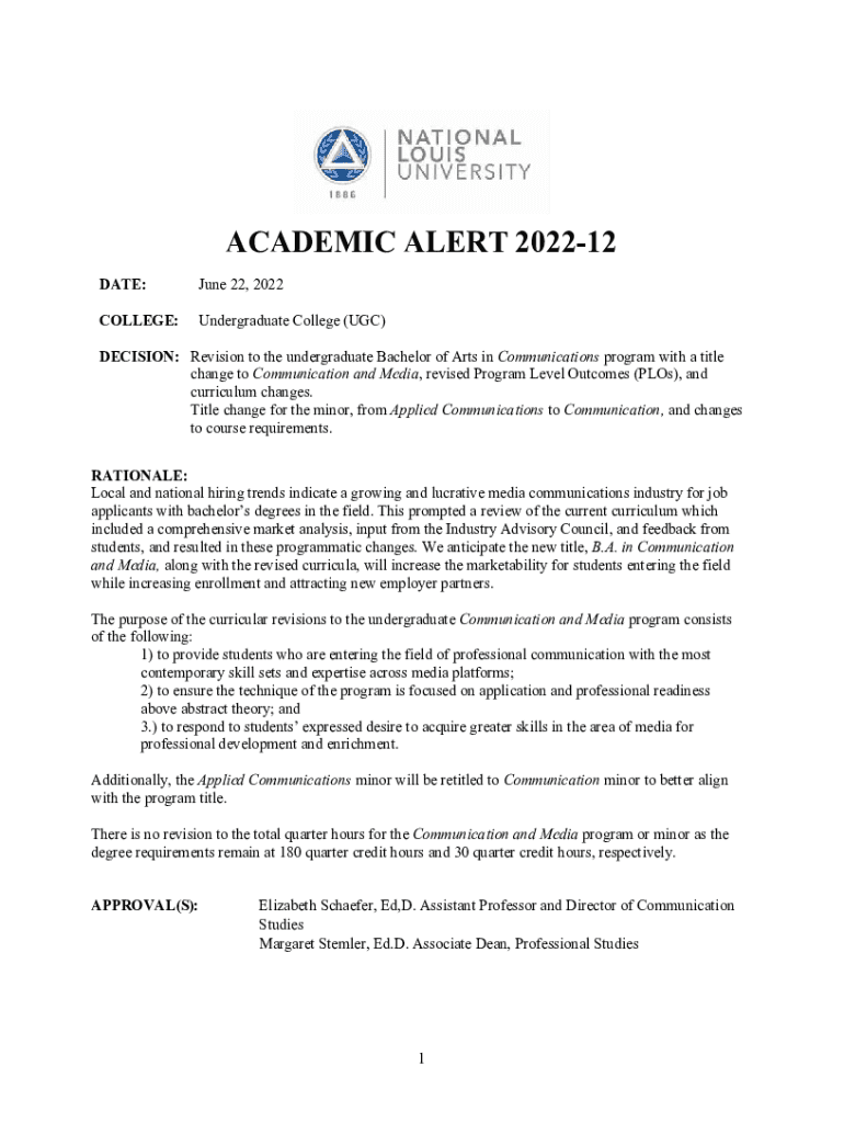 ACADEMIC ALERT 202212 DATE:June 22, 2022COLLEGE:Undergraduate College (UGC)DECISION: Revision to the undergraduate Bachelor of Arts in Communications program with a title change to Communication and