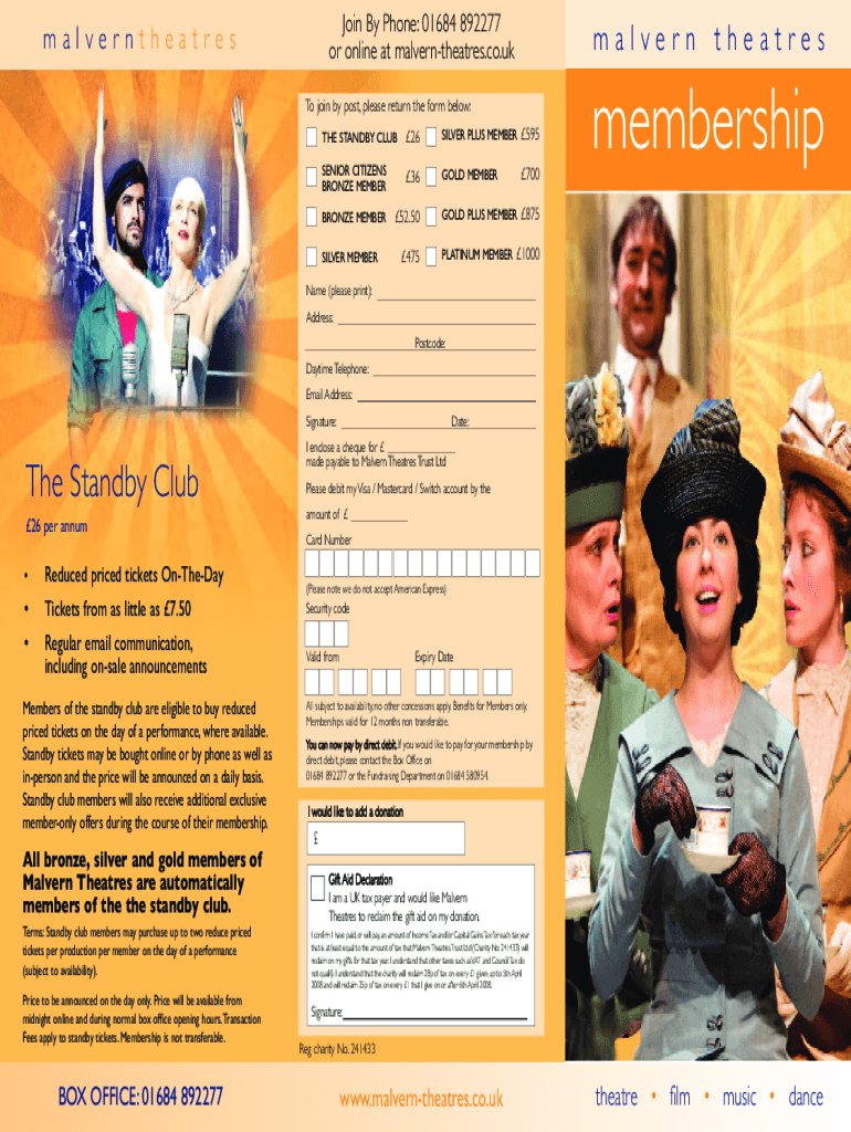 Tavern theatresJoin By Phone: 01684 892277 or online at malverntheatres.co.ukmalverntheatresTo join by post, please return the form below: 26THE STANDBY CLUBSENIOR CITIZENS BRONZE MEMBER SILVER Membrane