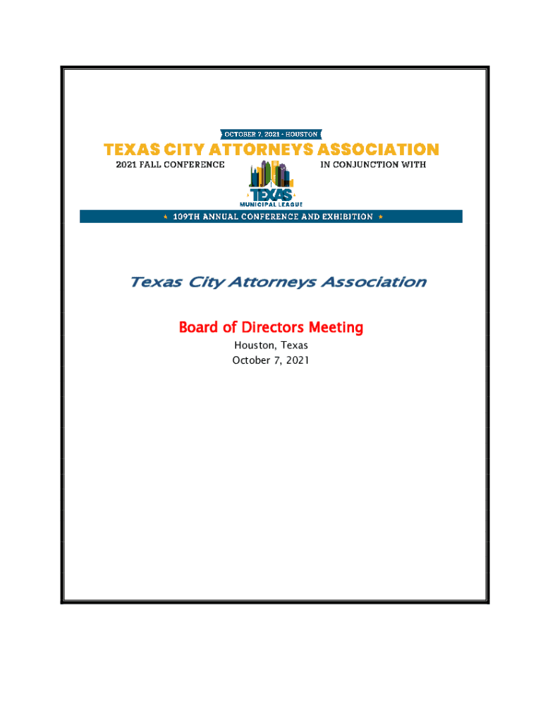 Texas City Attorneys AssociationBoard of Directors Meeting Houston, Texas October 7, 2021Agenda NCAA Board of Directors October 7, 2021, Houston, TX 5:15 p.m. 1. Consider minutes of the August 4,
