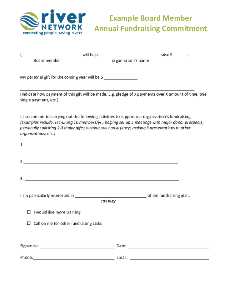 Example Board Member Annual Fundraising Commitment I, ___ will help ___ raise $___. Board member organizations name My personal gift for the coming year will be $ ___. ___ (Indicate how payment of