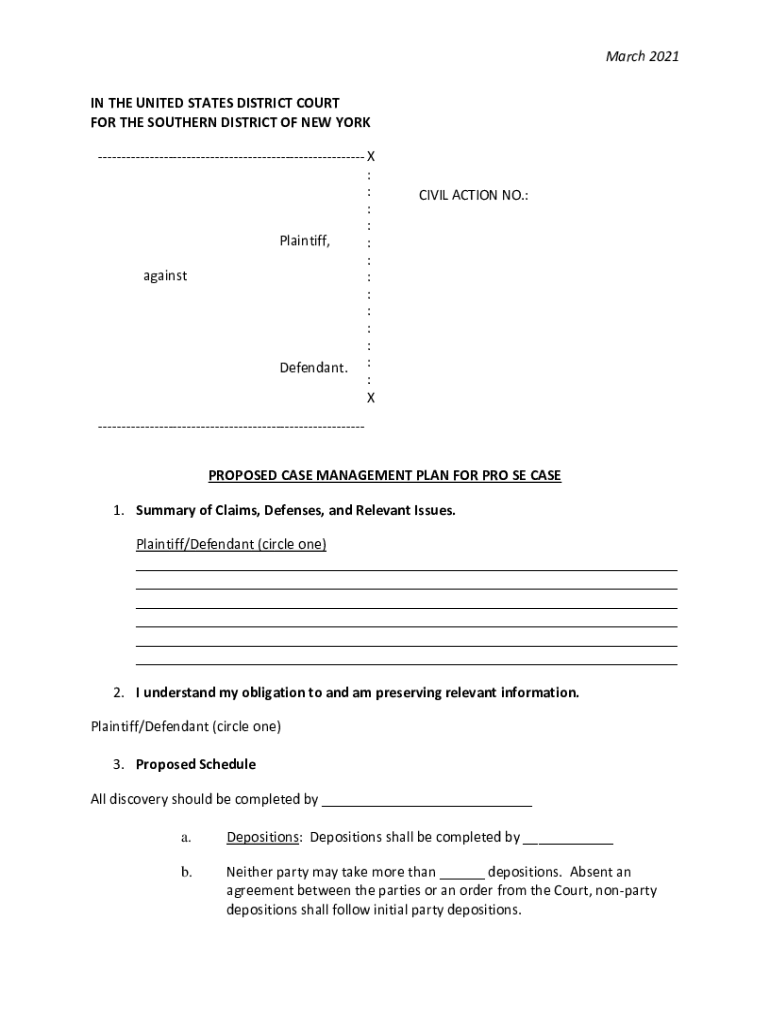 March 2021 IN THE UNITED STATES DISTRICT COURT FOR THE SOUTHERN DISTRICT OF NEW YORK X : : : : Plaintiff, : : against : : : : : Defendant. CIVIL ACTION NO.:PROPOSED CASE MANAGEMENT PLAN FOR PRO SE