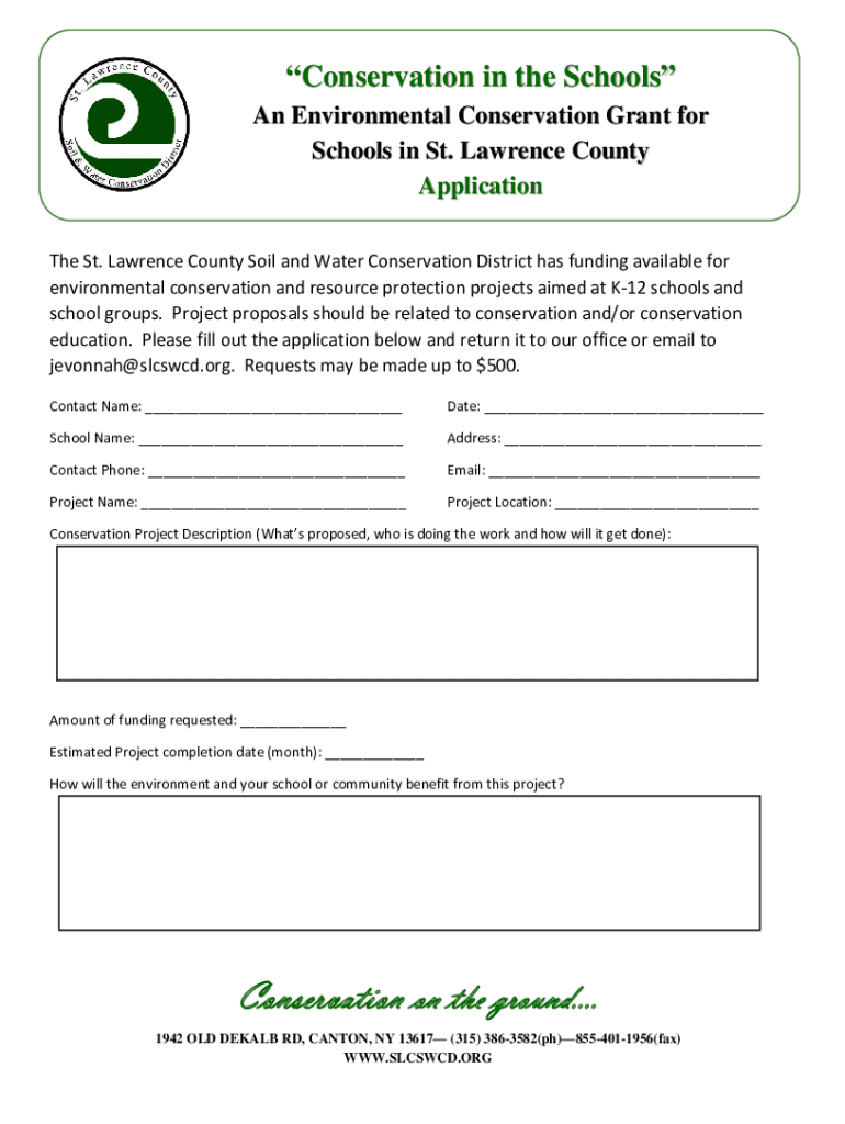 Conservation in the Schools An Environmental Conservation Grant for Schools in St. Lawrence County Application The St. Lawrence County Soil and Water Conservation District has funding available for