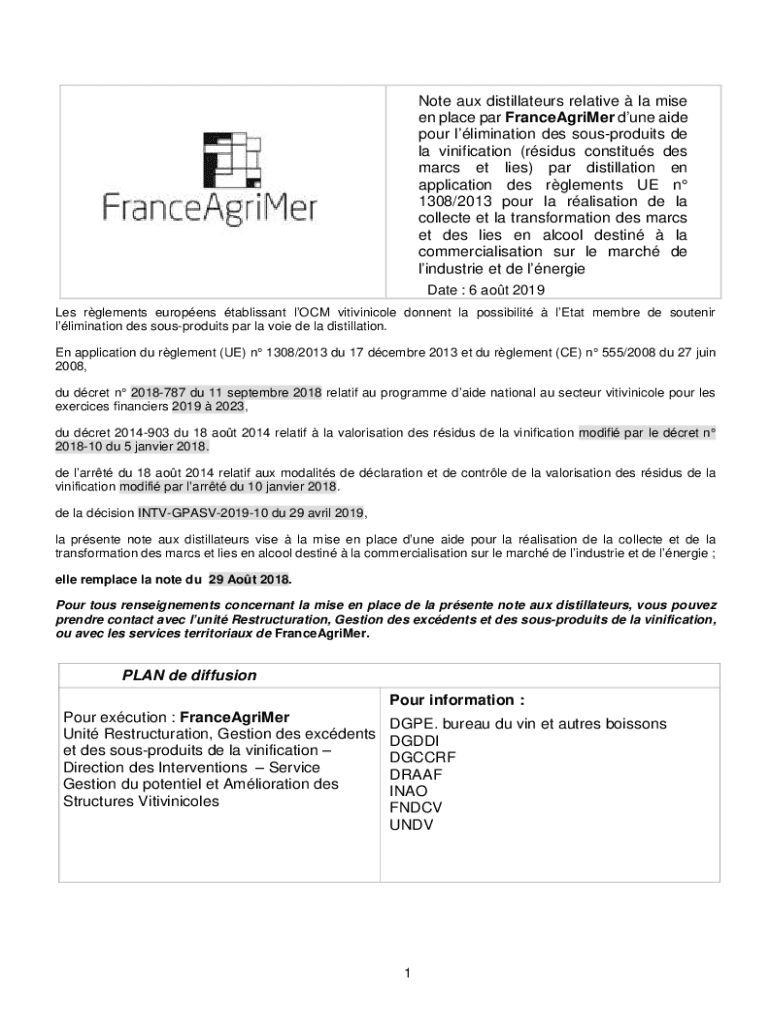 Note aux distillates relative la mile en place par FranceAgriMer dune aide pour elimination DES sousproduits de la vilification (sides constitute DES March ET lies) par distillation en application