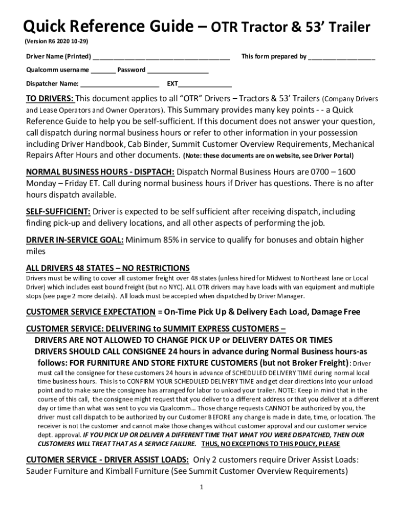 Quick Reference Guide OR Tractor & 53 Trailer (Version R6 2020 1029)Driver Name (Printed) ___ Qualcomm username Dispatcher Name:Passwords form prepared by ______ EX TTO DRIVERS: This document applies