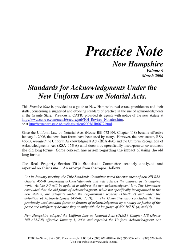 Practice Note New Hampshire Volume 9 March 2006Standards for Acknowledgments Under the New Uniform Law on Notarial Acts. This Practice Note is provided as a guide to New Hampshire real estate practitioners