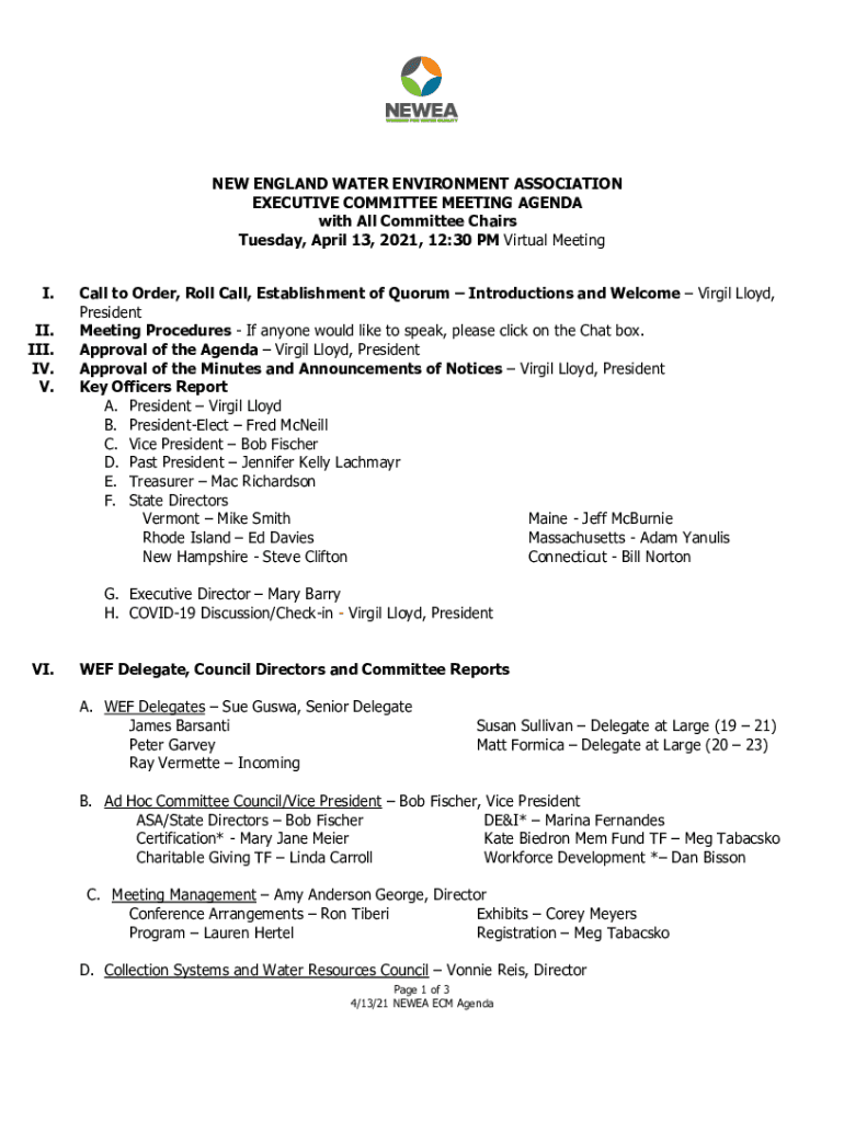 NEW ENGLAND WATER ENVIRONMENT ASSOCIATION EXECUTIVE COMMITTEE MEETING AGENDA with All Committee Chairs Tuesday, April 13, 2021, 12:30 PM Virtual Meeting I. II. III. IV. V. Call to Order, Roll Call,