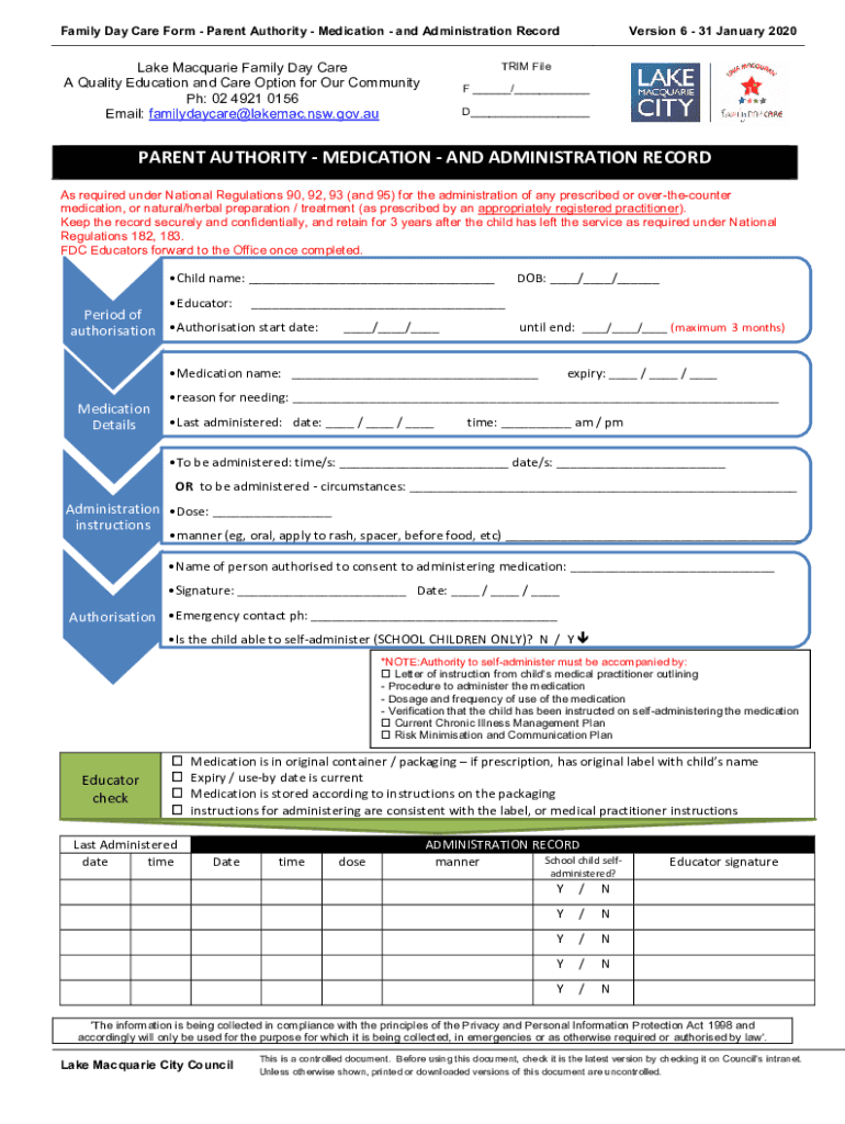 Family Day Care Form Parent Authority Medication and Administration Reconversion 6 31 January 2020TRIM Filename Macquarie Family Day Care A Quality Education and Care Option for Our Community pH: