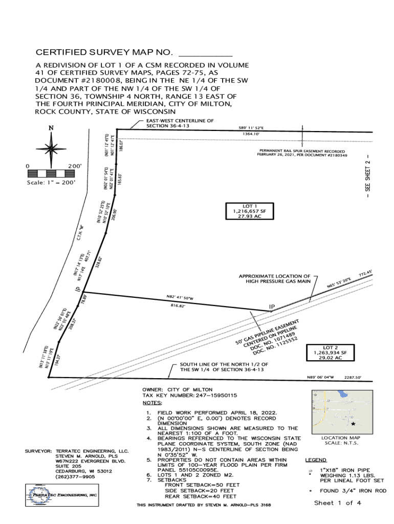 CERTIFIED SURVEY MAP NO. ___ A DIVISION OF LOT 1 OF A CSM RECORDED IN VOLUME 41 OF CERTIFIED SURVEY MAPS, PAGES 7275, AS DOCUMENT #2180008, BEING IN THE NE 1/4 OF THE SW 1/4 AND PART OF THE NW 1/4
