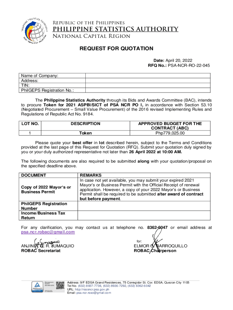 Republic of the PhilippinesPHILIPPINE STATISTICS AUTHORITY National Capital Region REQUEST FOR QUOTATION Date: April 20, 2022, RFQ No.: PSANCRRO22045 Name of Company: Address: TIN: Phillips Registration