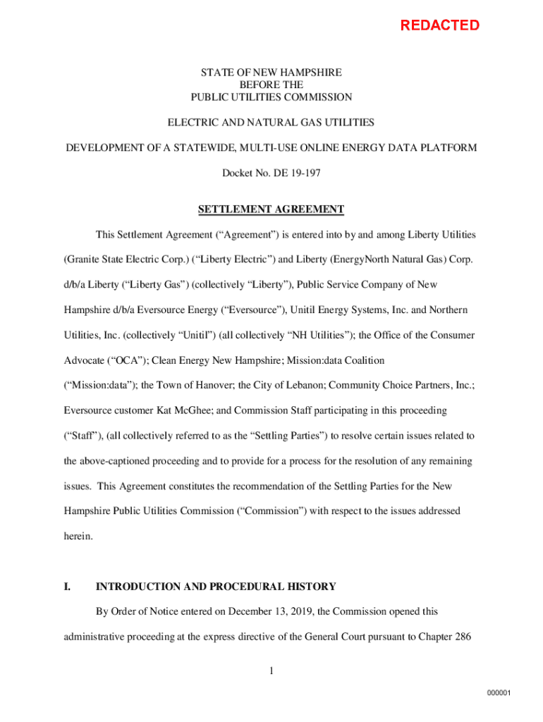 REDACTED STATE OF NEW HAMPSHIRE BEFORE THE PUBLIC UTILITIES COMMISSION ELECTRIC AND NATURAL GAS UTILITIES DEVELOPMENT OF A STATEWIDE, MULTIUSE ONLINE ENERGY DATA PLATFORM Docket No. DE 19197 SETTLEMENT