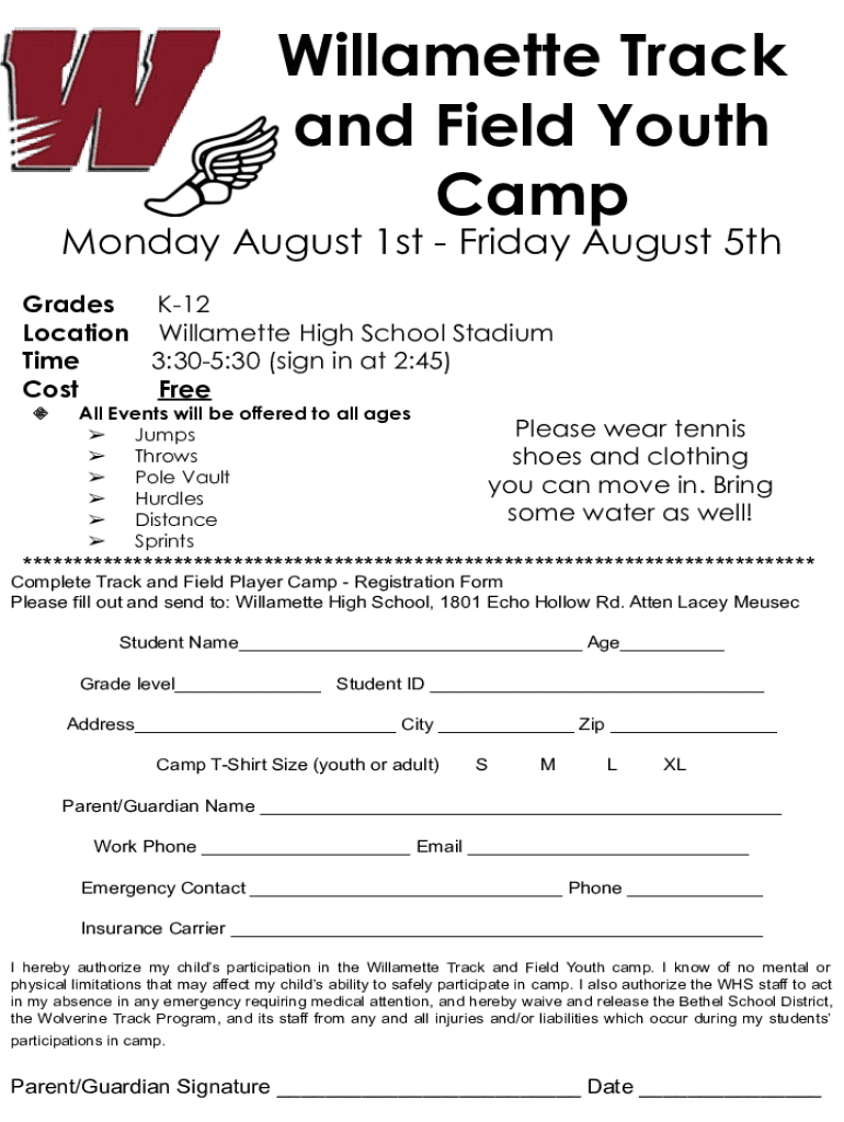 Get the free Willamette Track and Field Youth Camp - Bethel School District