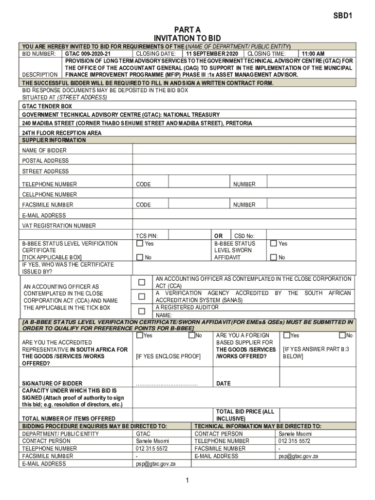 SBD1 PART A INVITATION TO BID YOU ARE HEREBY INVITED TO BID FOR REQUIREMENTS OF THE (NAME OF DEPARTMENT/ PUBLIC ENTITY) BID NUMBER: GTA 009202021 CLOSING DATE: 11 SEPTEMBER 2020 CLOSING TIME: 11:00