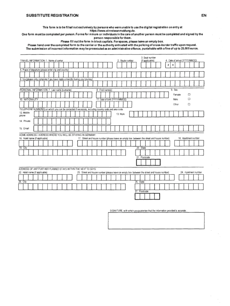 SUBSTITUTE Registrations form is to be filled out exclusively by persons who were unable to use the digital registration on entry at https://www.elnreiseanmeldung.de. One form must be completed per