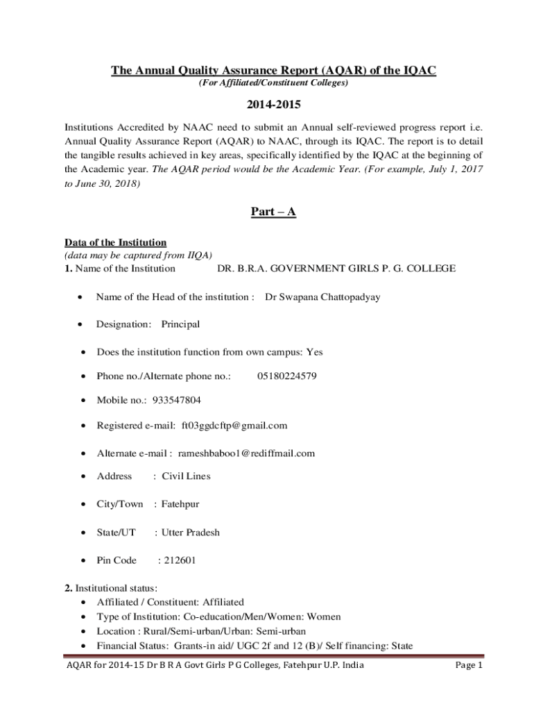 The Annual Quality Assurance Report (AGAR) of the IAC (For Affiliated/Constituent Colleges)20142015 Institutions Accredited by NAACP need to submit an Annual self reviewed progress report i.e. Annual