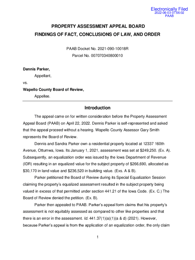 Electronically Filed 20220603 07:56:02 PAABPROPERTY ASSESSMENT APPEAL BOARD FINDINGS OF FACT, CONCLUSIONS OF LAW, AND ORDER SAAB Docket No. 202109010018R Parcel No. 007070340800010Dennis Parker, Appellant,