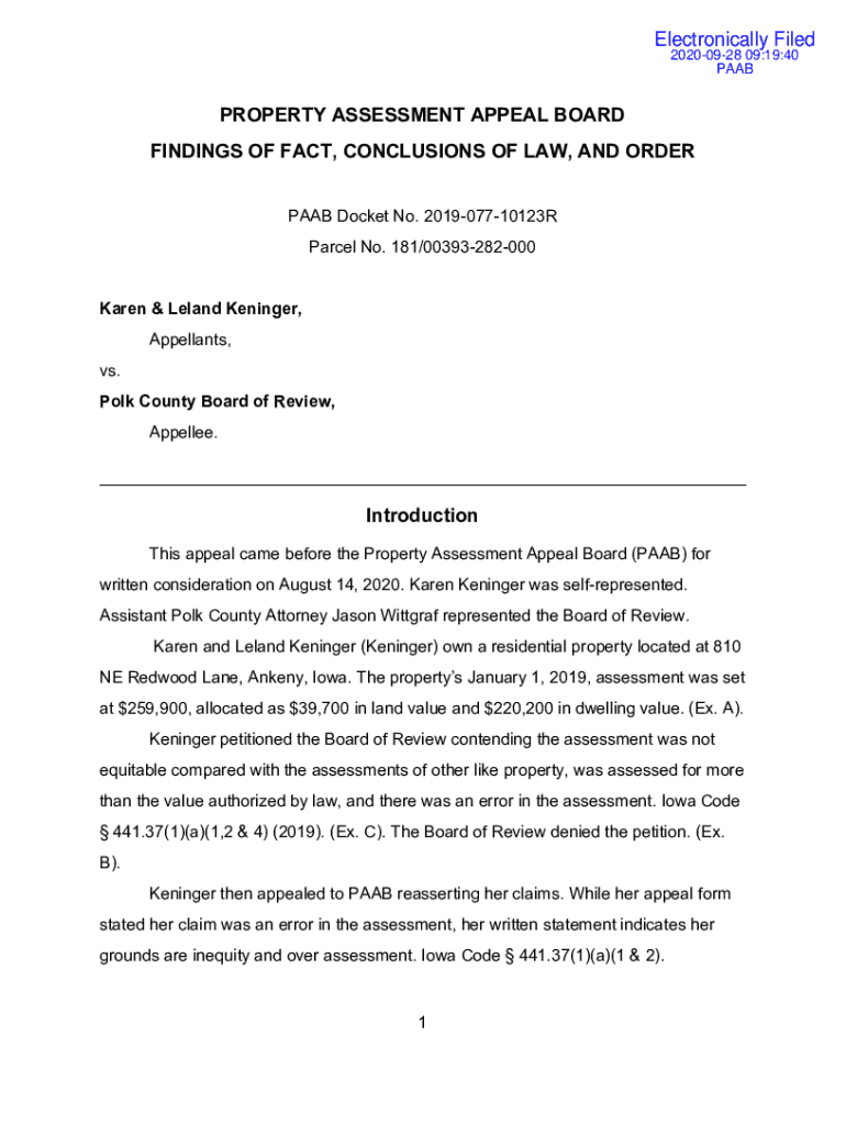 Electronically Filed 20200928 09:19:40 PAABPROPERTY ASSESSMENT APPEAL BOARD FINDINGS OF FACT, CONCLUSIONS OF LAW, AND ORDER SAAB Docket No. 201907710123R Parcel No. 181/00393282000Karen & Leland Meninges,