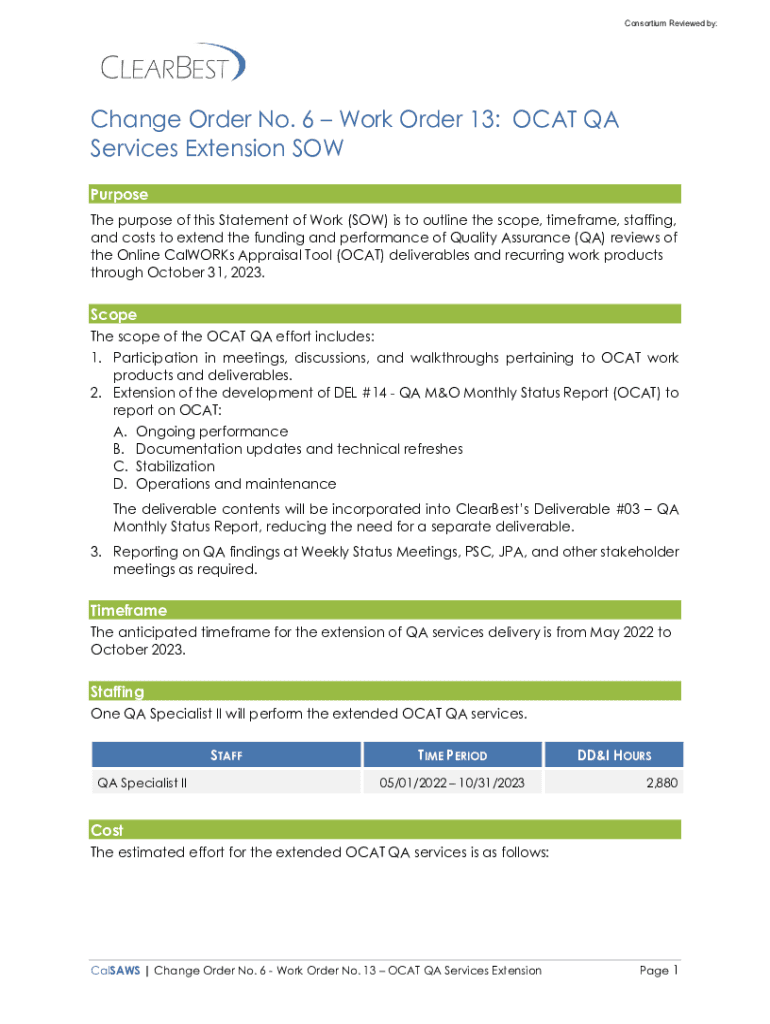 Consortium Reviewed by:Change Order No. 6 Work Order 13: CAT QA Services Extension SOW Purpose The purpose of this Statement of Work (SOW) is to outline the scope, timeframe, staffing, and costs to