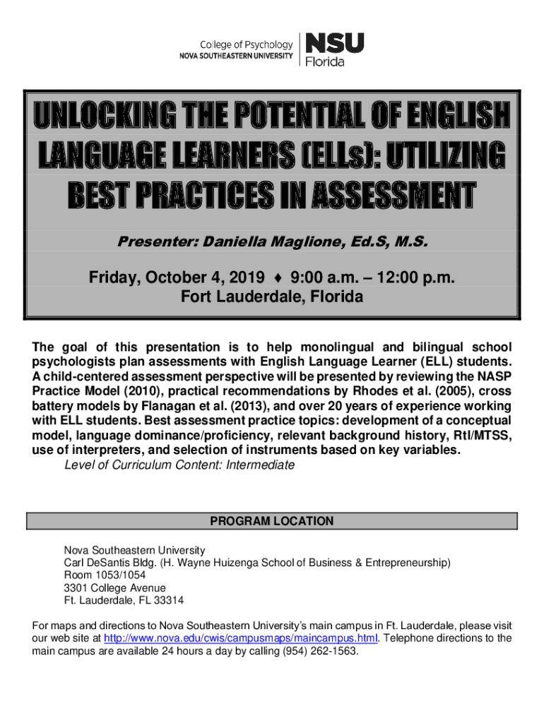 UNLOCKING THE POTENTIAL OF ENGLISH LANGUAGE LEARNERS (Ells): UTILIZING BEST PRACTICES IN ASSESSMENT Presenter: Daniella Malone, Ed. S, M.S. Friday, October 4, 2019 9:00 a.m. 12:00 p.m. Fort Lauderdale,
