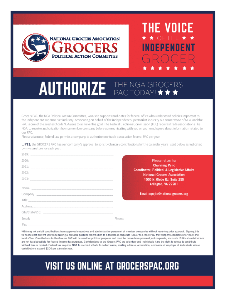 THE VOICE OF THEINDEPENDENTGROCERAUTHORIZETHE NGA GROCERS PAC TODAY! Grocers PAC, the NGA Political Action Committee, works to support candidates for federal office who understand policies important