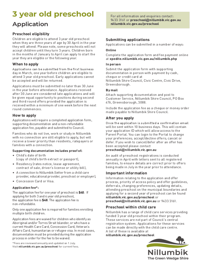 3-year-old preschool Application all information and inquiries contact: 9433 3161 or preschool@nillumbik.vic.gov.au nillumbik.vic.gov.au/preschoolPreschool eligibility Children are eligible to attend