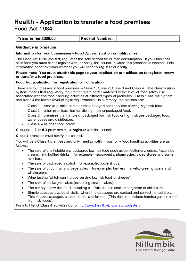 Health Application to transfer food premises Food Act 1984Transfer fee $380.00Receipt Number:Guidance information for food businesses Food Act registration or notification The Food Act 1984 (the Act)