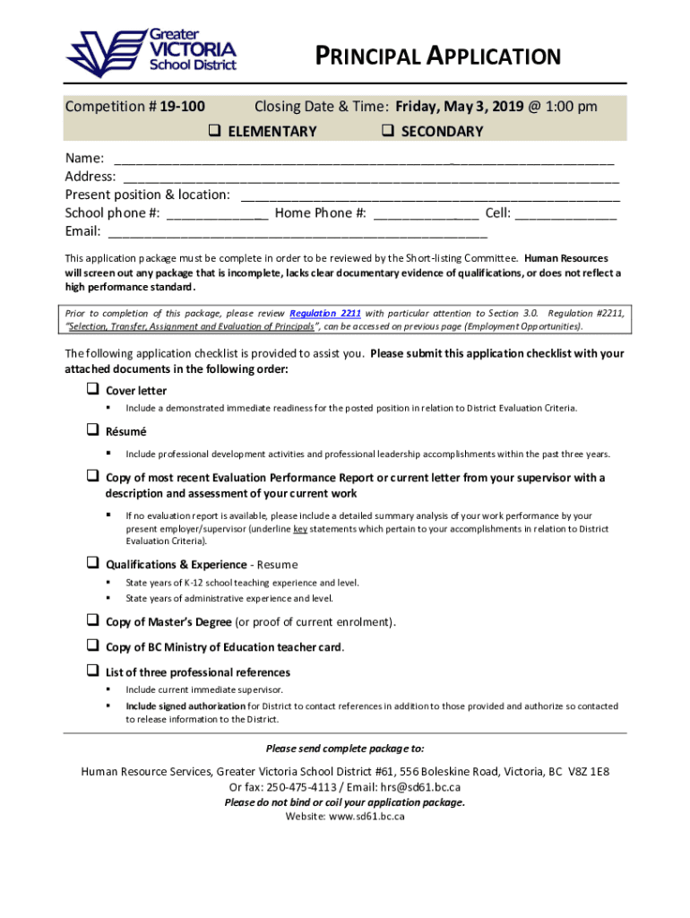 PRINCIPAL APPLICATION Competition # 19100Closing Date & Time: Friday, May 3, 2019 @ 1:00 pm ELEMENTARY SECONDARYName: ___ ___ Address: ___ Present position & location: ___ School phone #: ___ _ Home