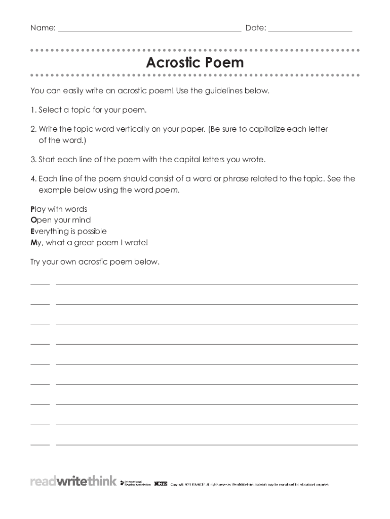Name: ___Date: ___Acrostic Poem You can easily write an acrostic poem! Use the guidelines below. 1. Select a topic for your poem. 2. Write the topic word vertically on your paper. (Be sure to capitalize