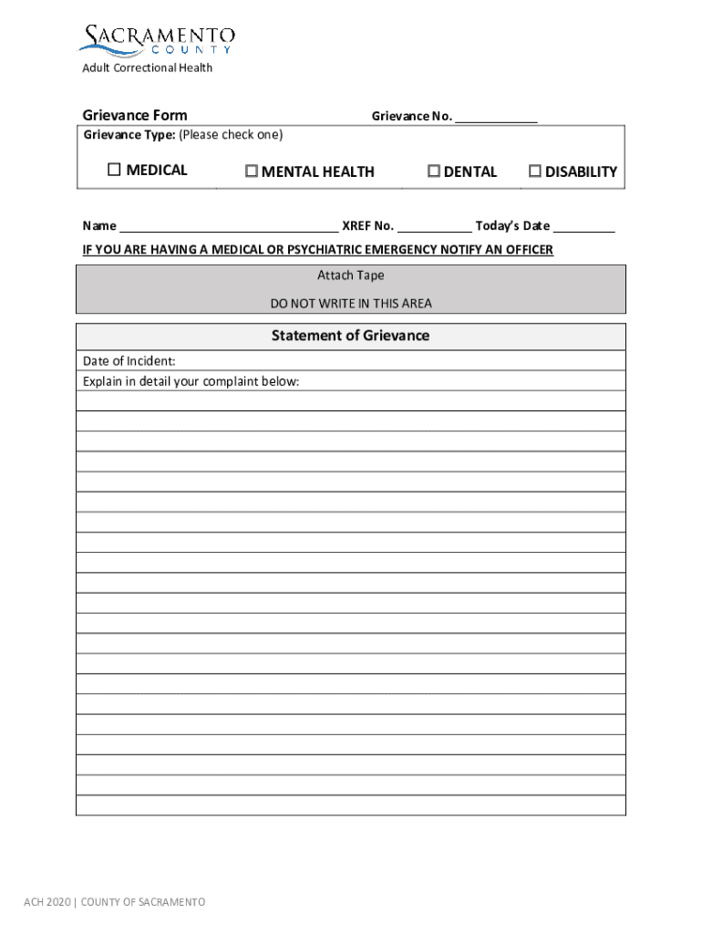 Adult Correctional HealthGrievance FormGrievance Type: (Please check one) MEDICALGrievance No. ___ MENTAL HEALTH DENTAL DISABILITYName ___ XREF No. ___ Today's Date ___