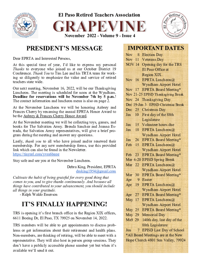 El Paso Retired Teachers Association November 2022 Volume 9 Issue 4PRESIDENTS MESSAGE Dear EPITA and Interested Persons, At this special time of year, I'd like to express my personal Thanks to everyone