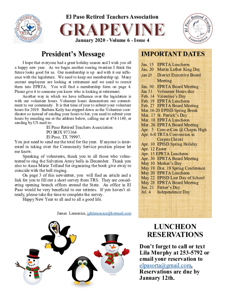 El Paso Retired Teachers Association January 2020 Volume 6 Issue 4Presidents MessageIMPORTANT DATES hope that everyone had a great holiday season and I wish you all a happy new year. As we begin another