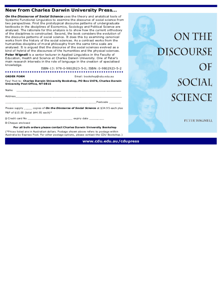 NewfromCharlesDarwinUniversityPress OntheDiscourseofSocialScienceusesthetheoryandanalyticaltoolsof SystemicFunctionalLinguisticstoexaminethediscourseofsocialsciencefrom two perspectives. Firsttheprototypicaldiscoursepatternsofundergraduate