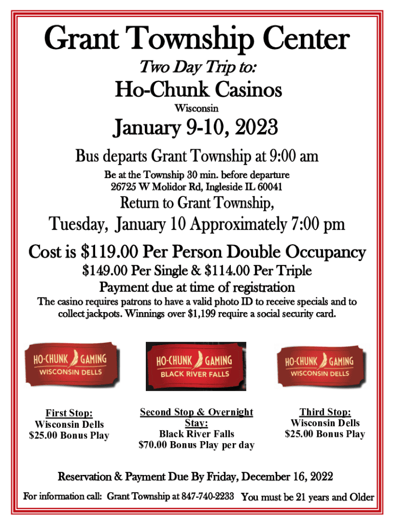 Grant Township Center Two Day Trip to:Ho Chunk Casinos Wisconsin January 910, 2023 Be at the Township 30 min. before departure 26725 W Monitor Rd, Inside IL 60041Cost is $119.00 Per Person Double