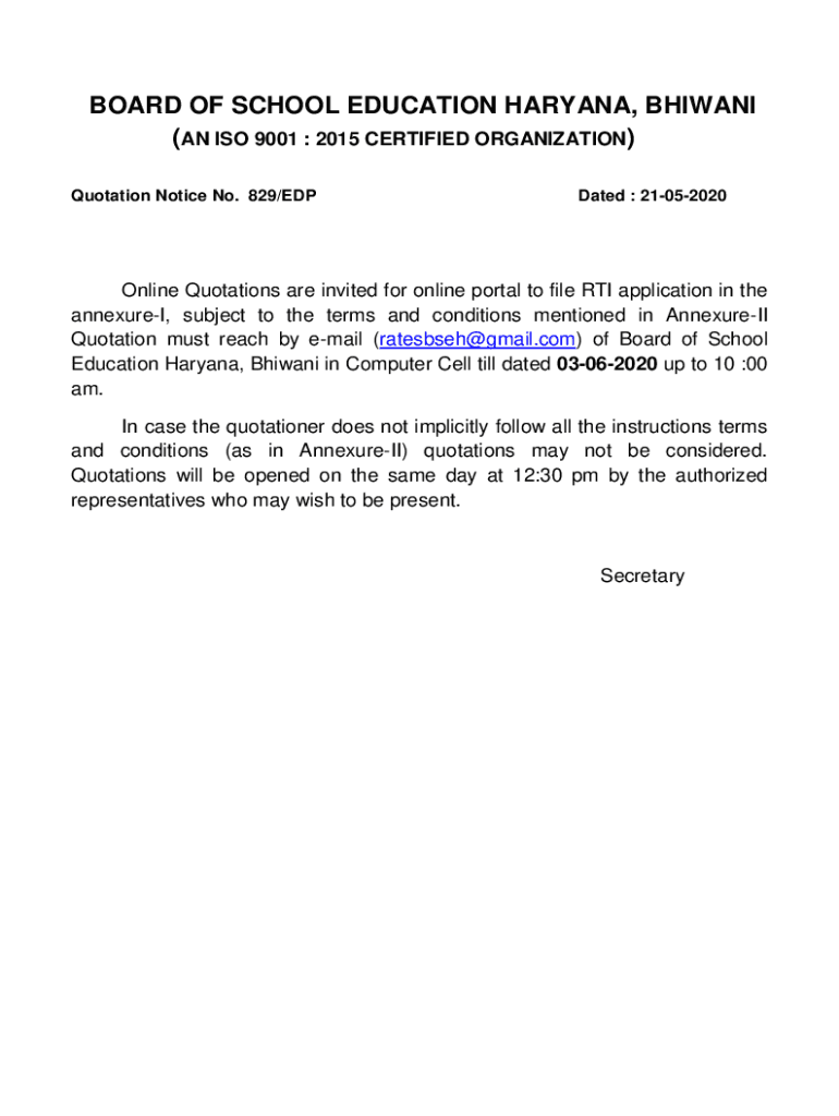 BOARD OF SCHOOL EDUCATION HARYANA, BHIWANDI (AN ISO 9001 : 2015 CERTIFIED ORGANIZATION) Quotation Notice No. 829/Educated : 21052020Online Quotations are invited for online portal to file RTI application