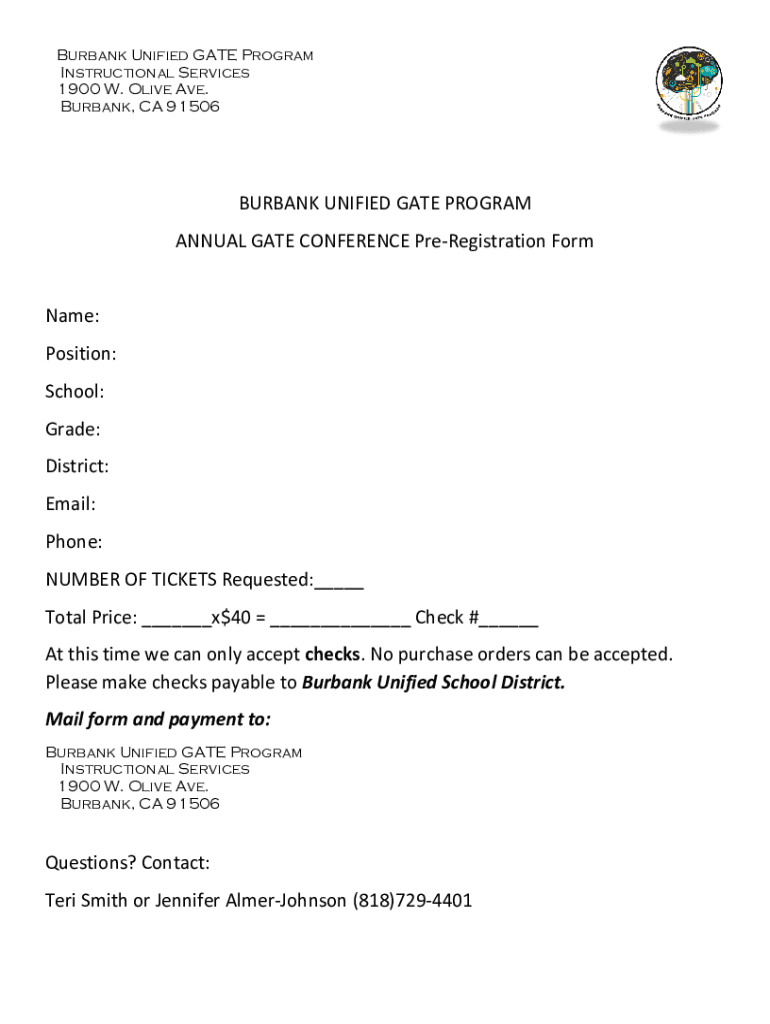 Burbank Unified GATE Program Instructional Services 1900 W. Olive Ave. Burbank, CA 91506BURBANK UNIFIED GATE PROGRAM ANNUAL GATE CONFERENCE Preregistration Form Name: Position: School: Grade: District:
