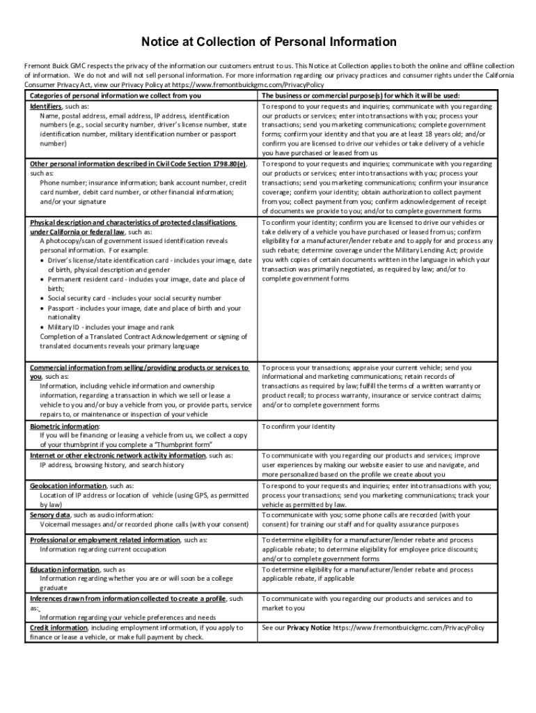 Notice at Collection of Personal Information Fremont Buick GMC respects the privacy of the information our customers entrust to us. This Notice at Collection applies to both the online and offline