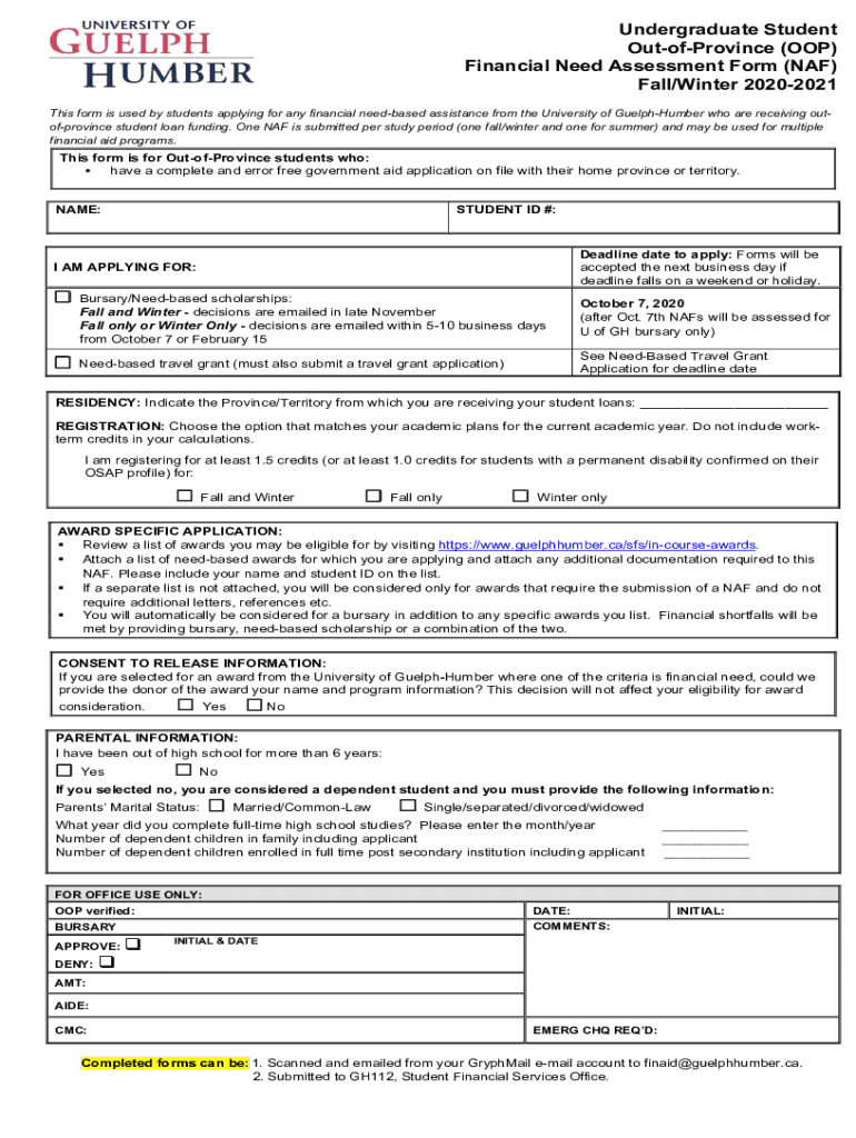 Undergraduate Student OutofProvince (OOP) Financial Need Assessment Form (NAF) Fall/Winter 20202021 This form is used by students applying for any financial need based assistance from the University
