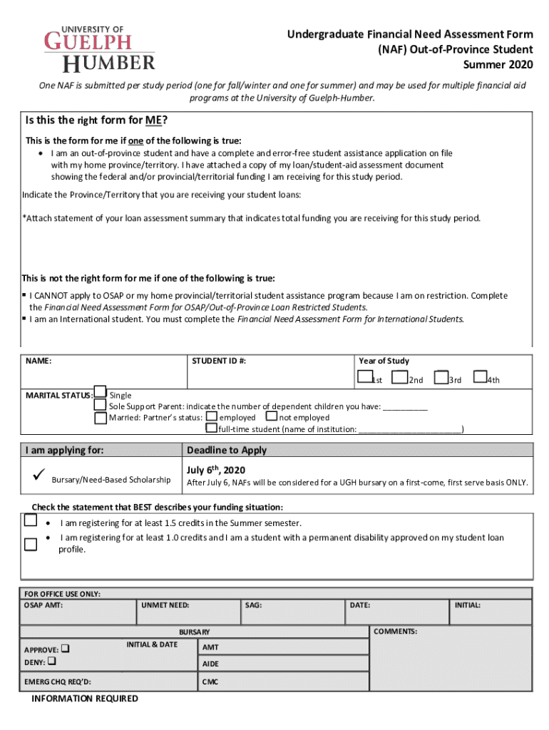 Undergraduate Financial Need Assessment Form (NAF) OutofProvince Student Summer 2020 One NAF is submitted per study period (one for fall/winter and one for summer) and may be used for multiple financial