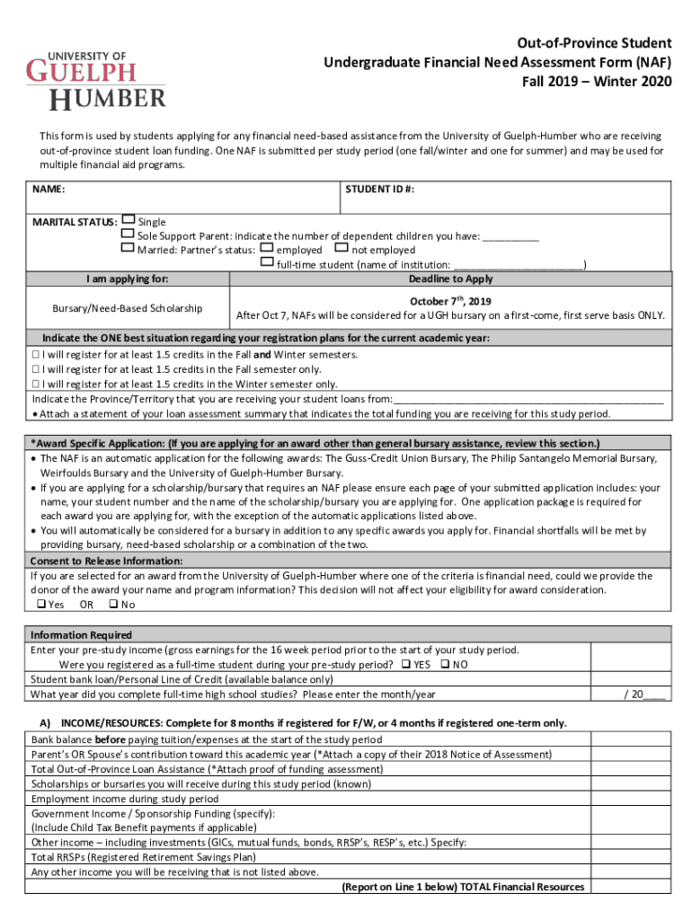 OutofProvince Student Undergraduate Financial Need Assessment Form (NAF) Fall 2019 Winter 2020 This form is used by students applying for any financial need based assistance from the University of