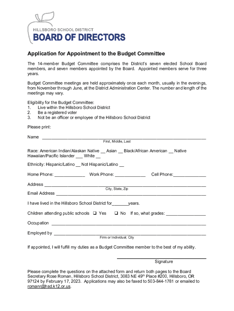 Application for Appointment to the Budget Committee The 14member Budget Committee comprises the Districts seven elected School Board members, and seven members appointed by the Board. Appointed members