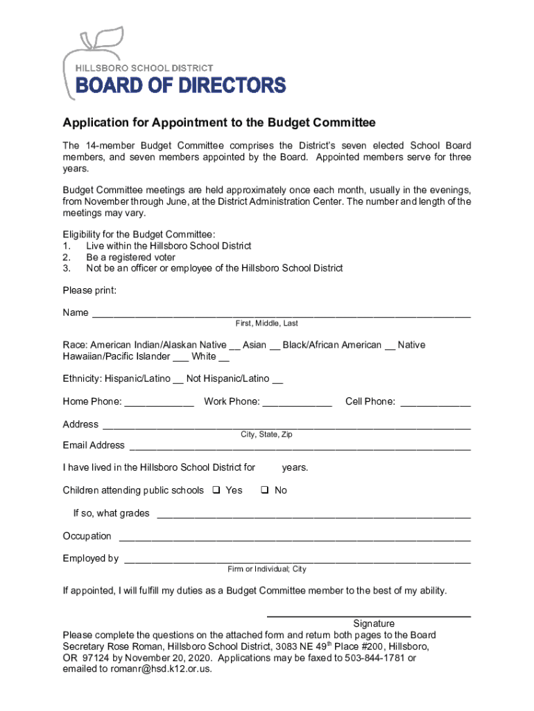 Application for Appointment to the Budget Committee The 14member Budget Committee comprises the Districts seven elected School Board members, and seven members appointed by the Board. Appointed members